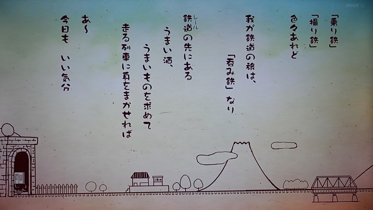 さて、偐家持氏との共通項というテレビ番組は、乗り鉄,撮り鉄,いろいろあれど、我が鉄道の旅は「呑み鉄」なり…「六角精児の呑み鉄本線・日本旅」で、乗れば乾杯(たいがいはビール)、途中下車しては試飲(地酒が多い)そして夜は飲み屋で乾杯、終点でも乾杯(ワンカップ酒が多い)と8年間乗っては飲みを繰り広げている番組です。
