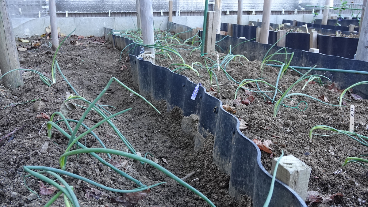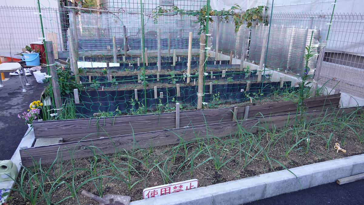 手前からニンニク、スナップエンドウ、久留米エンドウ、そら豆そしてレタスなど少しの葉野菜とパンジーと茗荷です。パンジーは愛するNちゃん(孫)のご要望に従って場違いですが植えています。早く大きく育て・・・と願っています。